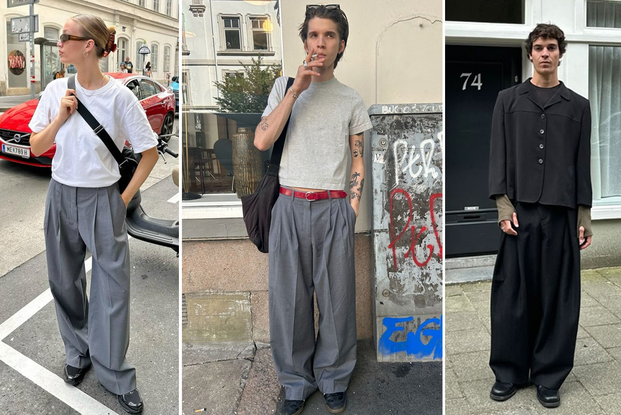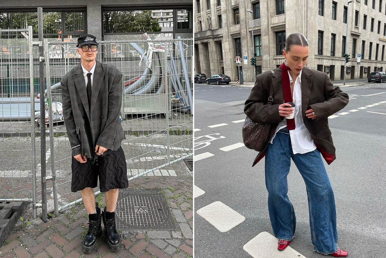 무심한 셔츠에 더 무심한 블레이저. 바지는 사라질 듯 좁거나 넓어요. 상체가 강조되기보다 묻히는 옷차림에 모든 선이 둥글고 어깨선은 O 실루엣으로 무너져 있어요. 움직일 때 생기는 실루엣이 더 중요한 스타일입니다.
