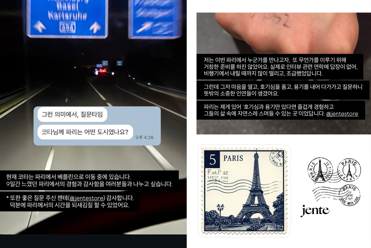 코타가 파리로의 여정을 시작하기 전, 유럽으로 떠나는 여정의 큰 목표 중 하나는 디자이너를 만나 인터뷰하는 것이라고 이야기해 주었습니다. 거장 디자이너가 탄생하는 유럽에서 그들과의 만남을 아주 고대하고 있다고요. 그가 젠테에 닿은 것처럼 그는 여러 디자이너에게 닿기 위해 여러 방면 연락을 하고 파리로 떠났는데요. 파리로 떠나기 전까지 인터뷰 관련된 답변이 오지 않아 비행기에서 많이 조급했었다고 해요. |