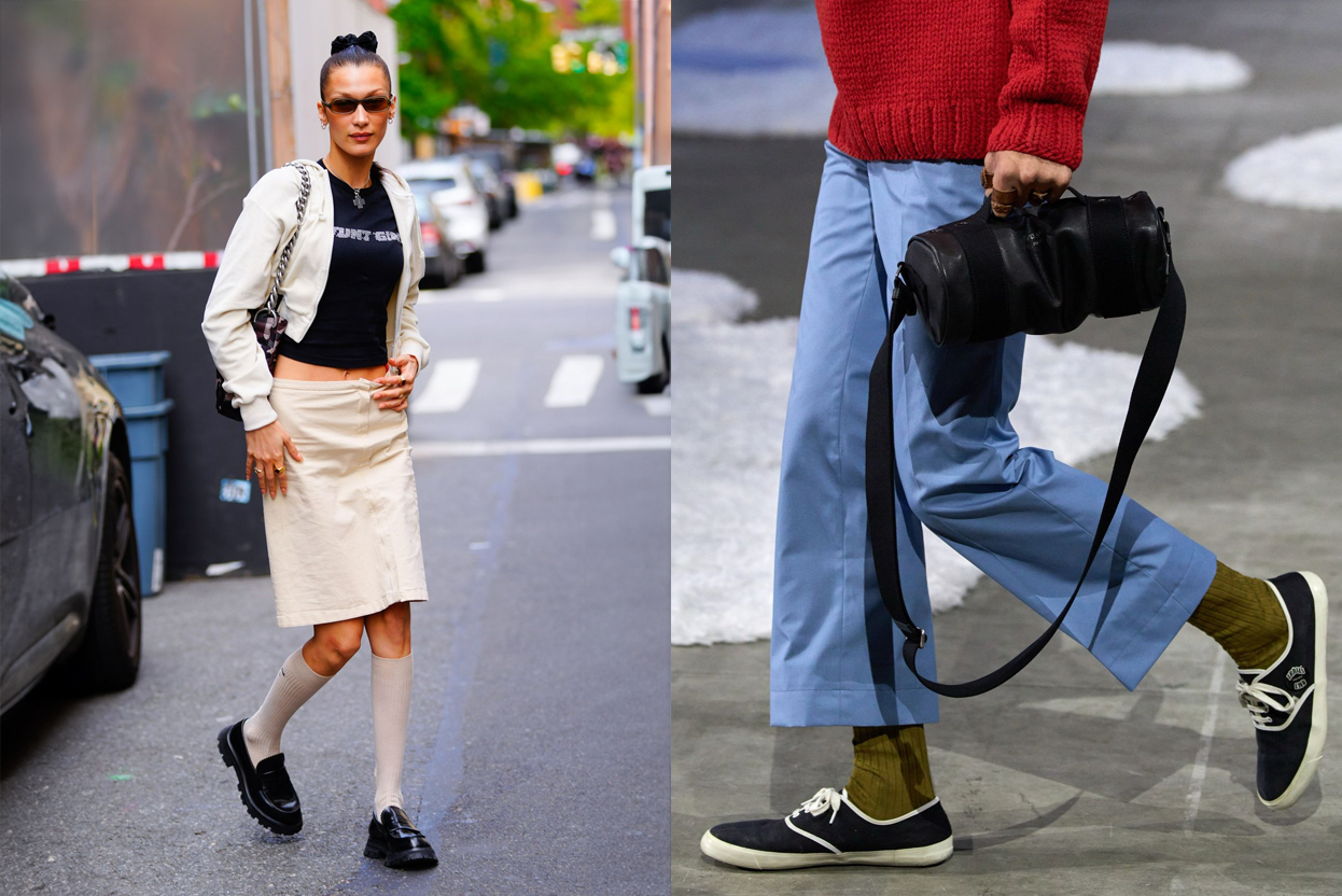 최근 컬렉션만 보아도 로퍼는 점점 더 두툼해지고, 스니커즈는 오히려 슬림해지고 있습니다. 왼쪽의 벨라 하디드가 신은 청키한 로퍼와 비슷한 느낌으로 말이죠. 오른쪽은 PRADA의 SS26 런웨이 사진입니다. 아직 늦지 않았습니다. 지금 저점 매수해야 올봄에 신을 수 있어요!