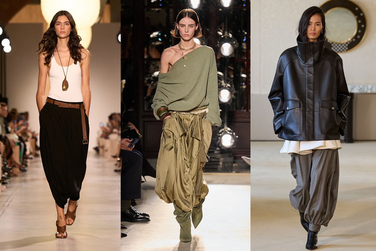 좌측부터 Michael Kors, Balmain, Altuzarra의 SS26 쇼입니다. 특히 Altuzarra의 세련된 컬렉션이 인상 깊었어요. 이제 제가 감히 올해 트렌드로 예측하는 팬츠를 소개해 볼게요. 실루엣은 따지자면 배럴 핏, 그 중에서도 하렘 팬츠입니다. '알라딘 팬츠'로도 불리며, 통이 넓고 편안해서 요가복으로 더욱 익숙한 팬츠죠. 이제는 요가원이 아닌 런웨이에서 반복적으로 보이는 추세예요. |