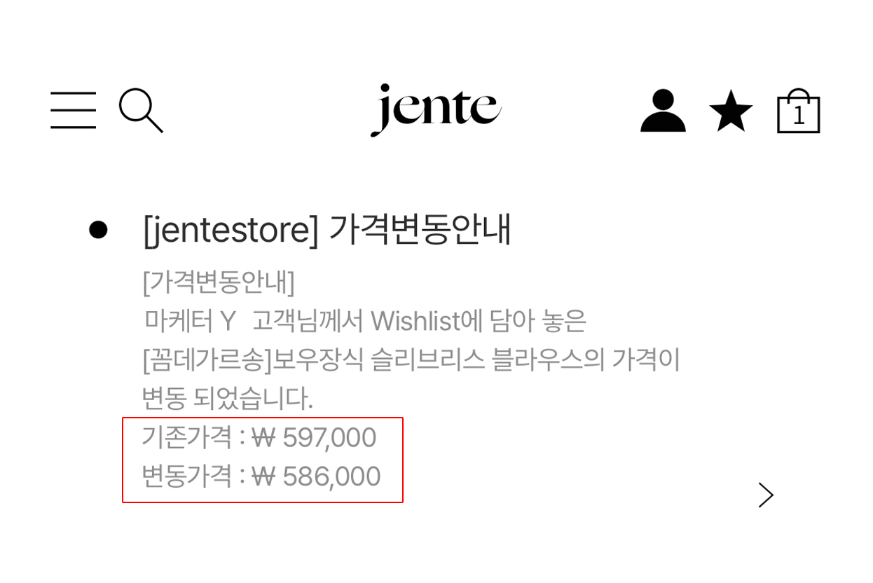 젠테 입문자 튜토리얼에서 소개했으나, 아무리 강조해도 지나치지 않은 위시리스트 이용 꿀팁! 고민되는 상품은 찜하기를 통해 위시리스트에 담아두세요. 가격이 떨어질 때마다 가격 변동 알람이 울립니다. 내 장바구니에 담아놨던 상품은 편하게 세일 여부를 확인할 수 있겠죠?